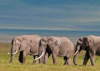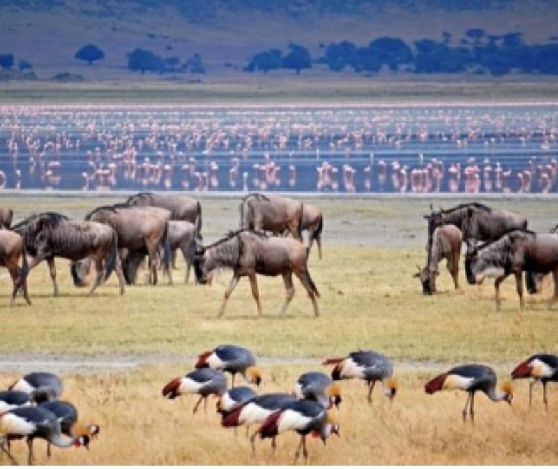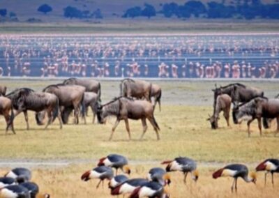 Das Ngorongoro Naturschutzgebiet umfasst sehr unterschiedliche Lebensräume: offenes Grasland, dichten Gebirgswald, Buschland und Heidelandschaften. Der Ngorongoro-Krater ist eine von sieben UNESCO Weltkulturerbestätten in Tansania. Der so genannte 610 Meter tiefe Krater“ ist eigentlich eine 260 Quadratkilometer große Caldera, er wird oft als „achtes Weltwunder“ bezeichnet und ist zweifellos die Hauptattraktion des Naturschutzgebietes. Der Kraterkessel ist ganzjährig der Lebensraum von etwa 25.000 großen Säugetieren. Darunter die Big Five. Nirgendwo in Afrika ist die Wahrscheinlichkeit, diesen Tieren zu begegnen, größer als hier. Der so genannte „größte Zoo der Welt“ ist außerdem Lebensraum für Geparde, Hyänen, Servale, Zebras, Gazellen, Gnus, Nilpferde, Affen und das selten gewordene Spitzmaulnashorn sowie Vogelarten wie Kronenkraniche, Adler, Pelikane, Strauße und Flamingos. Giraffen werden Sie allerdings keine sehen. Denen gelingt es nicht, durch den dichten Bergwald hinauf- und in den Krater hinabzusteigen
